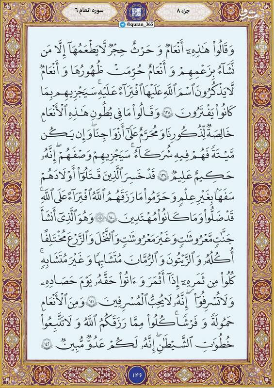 به گزارش پایگاه خبری تحلیلی صبح هامون ترتیل صفحه صد چهل و شش قرآن کریم  سوره مبارکه انعام را بخوانید.
